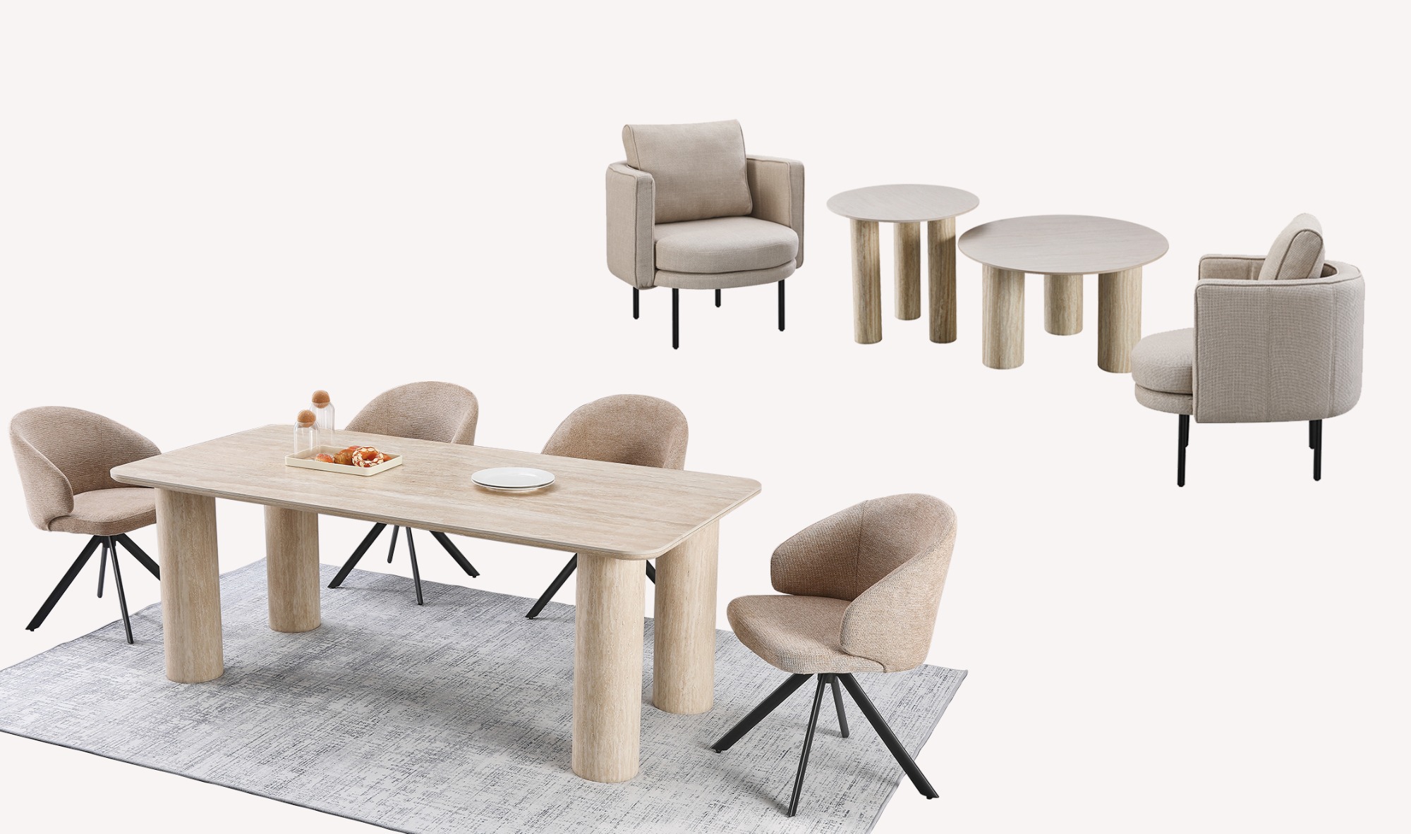 Both the tabletops of the coffee table and dining table feature a beautiful yellow travertine sintered stone, offering a luxurious and durable surface that is resistant to scratches. The cylindrical legs of the tables add a touch of artistic flair, elevating the overall aesthetic of the set.